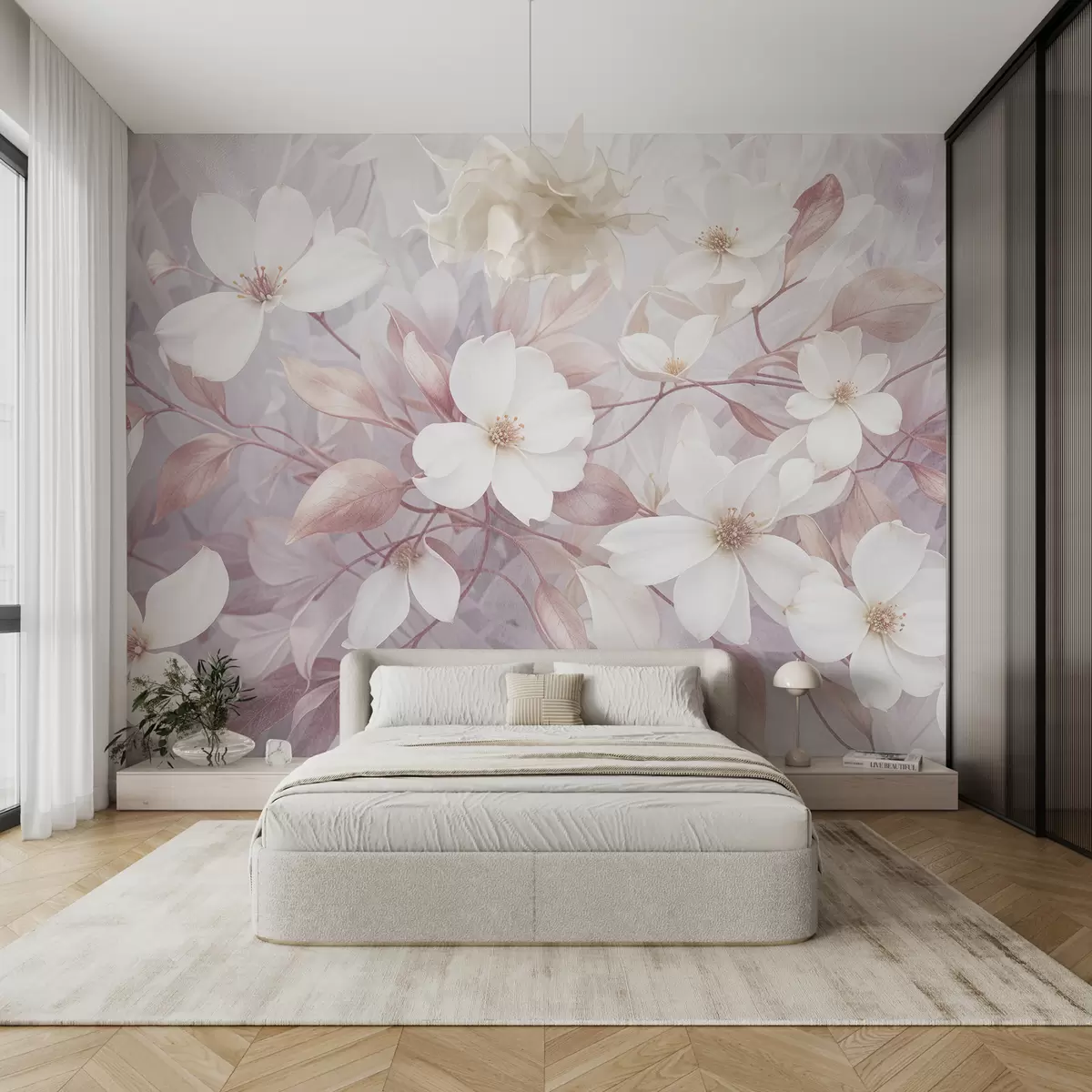 Fototapet Delikate lyserøde og hvide magnoliablomster blomstrer på bløde, slørede grene mod en bleg baggrund Nr. w08196