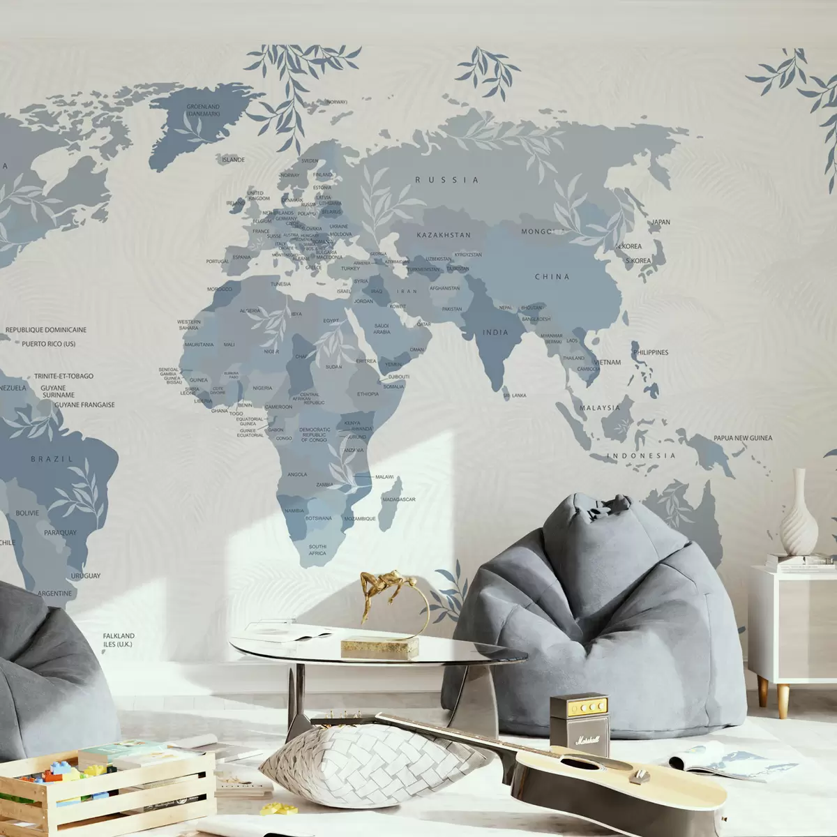 Fototapet Stilfuldt verdenskort med blade og planter blå farve Nr. w08211v4