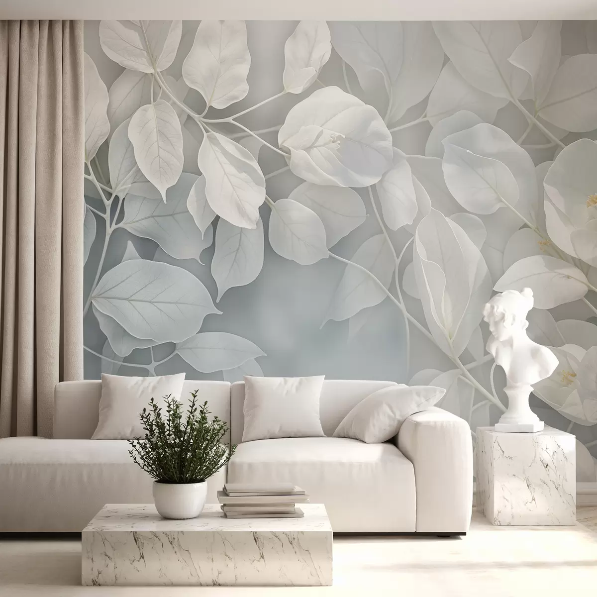 Fototapet Bløde, sarte hvide blomster med grågrønne blade på en sløret baggrund, der skaber en fredfyldt atmosfære Nr. w08232