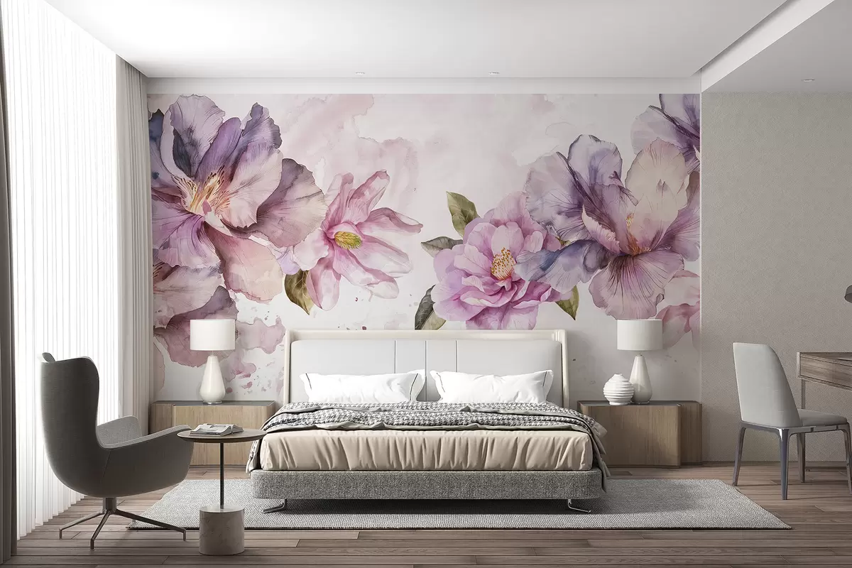 Fototapet Delikate lyserøde og lilla akvarelblomster med bløde kronblade og grønne blade mod en lys baggrund Nr. w08238