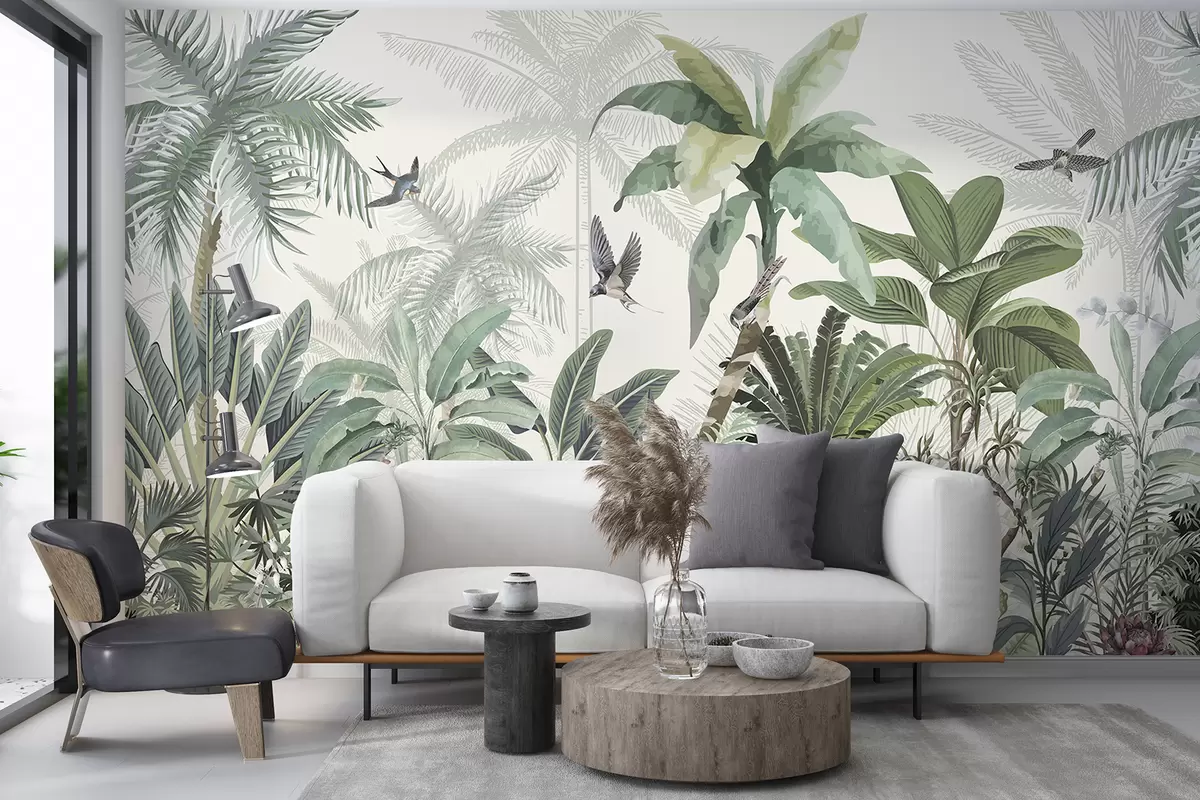 Fototapet En frodig tropisk junglescene med forskellige palmer, store blade og farverige blomster i forgrunden Nr. w08239