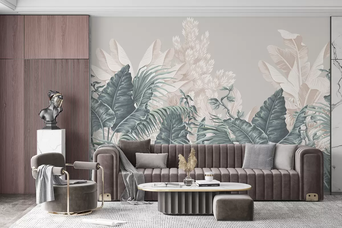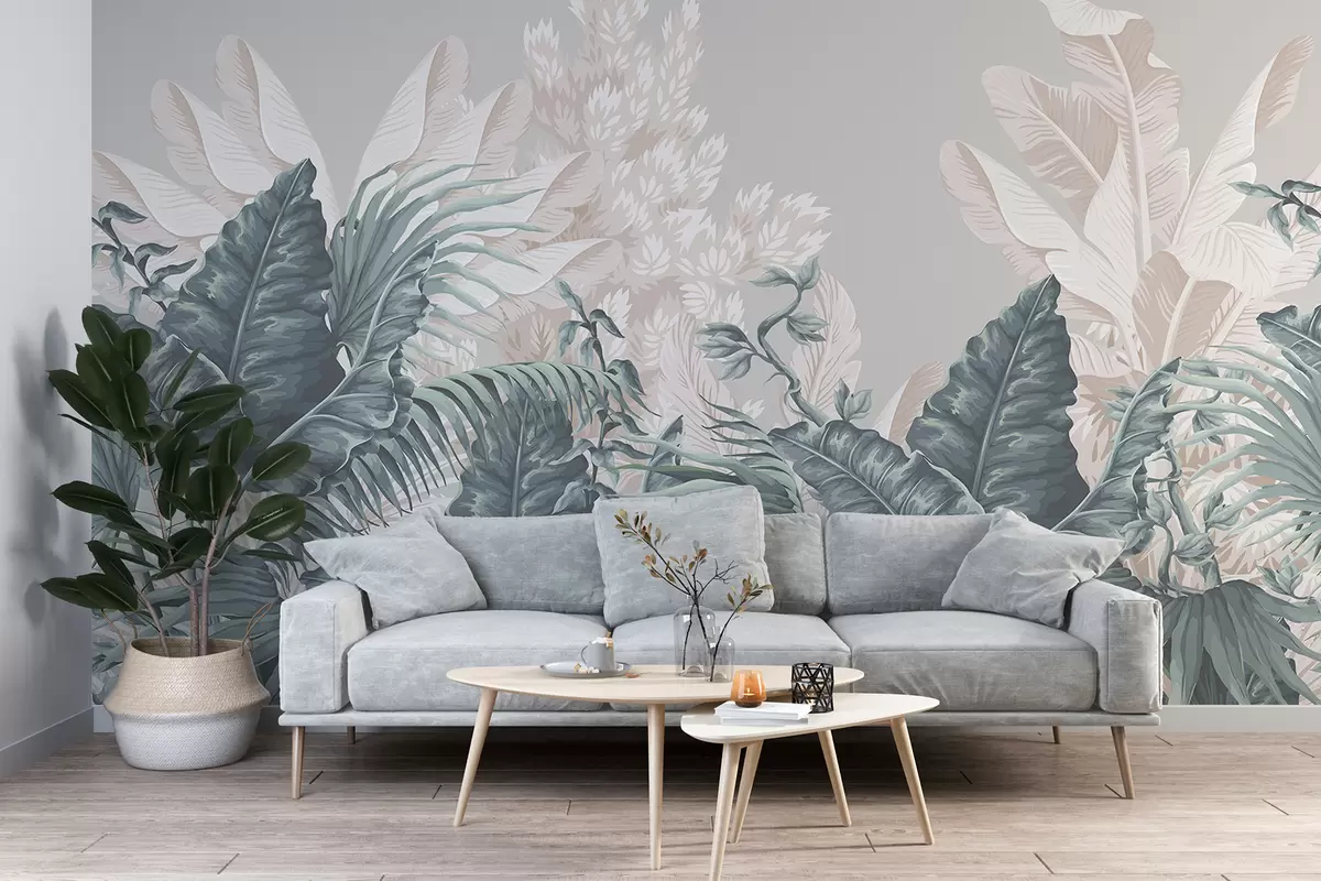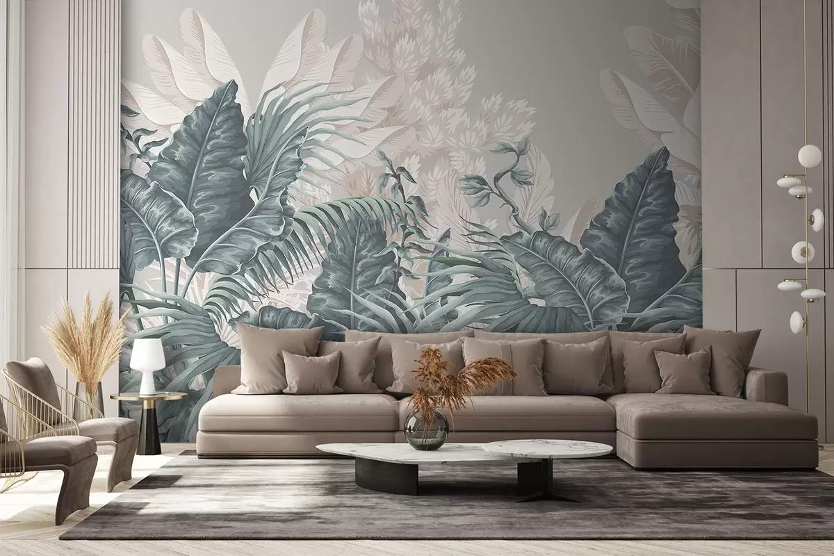 Fototapet En tropisk junglescene med store grønne blade og blomster i forgrunden, hvilket skaber en frodig atmosfære Nr. w08242