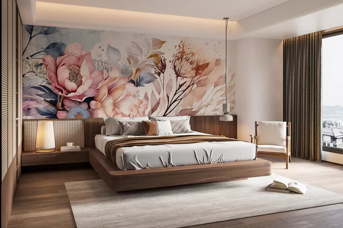 Fototapet Store lyserøde og blå blomster med fine kronblade, omgivet af mindre blomster mod en akvarelbaggrund Nr. w08256