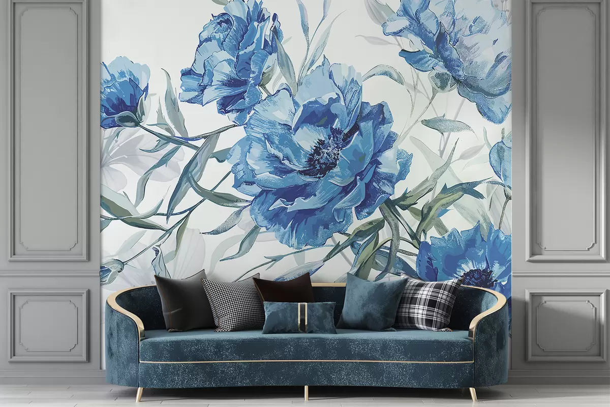 Fototapet Maleri af blå pæoner med frodigt løv mod en lys abstrakt baggrund Nr. w08274v1