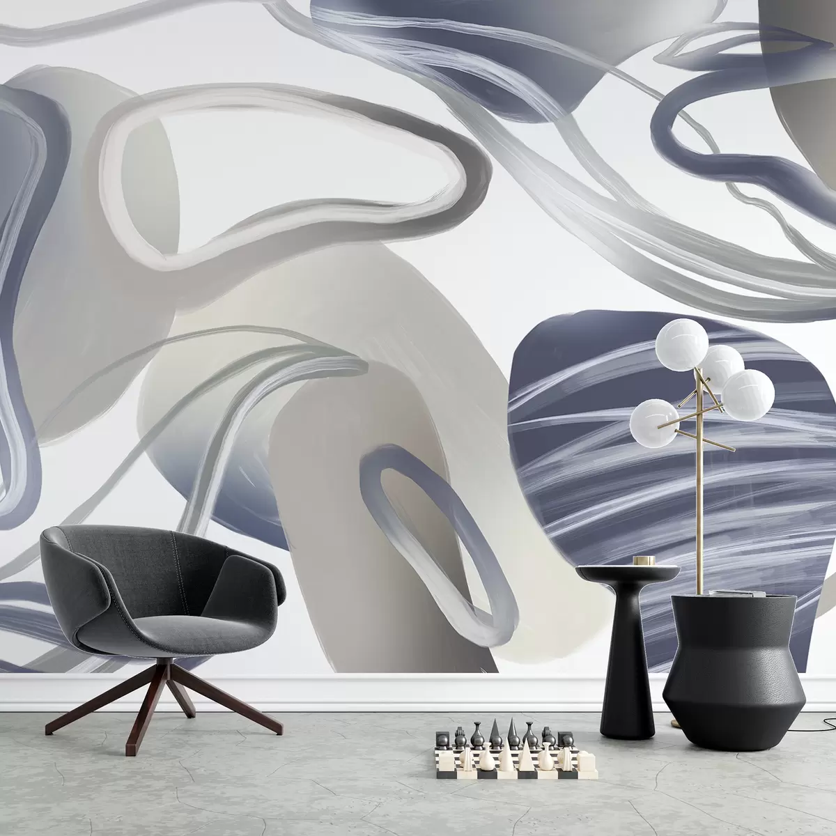 Fototapet Abstrakte hvirvlende former og kurver i mørkeblå nuancer skaber en dynamisk og flydende komposition Nr. w08279v1