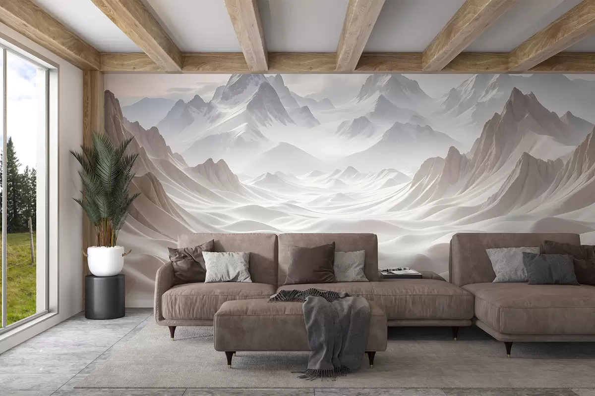 Fototapet Sneklædte bjergtoppe dukker op fra et tåget, æterisk landskab med bølgende bakker og dale Nr. w08313