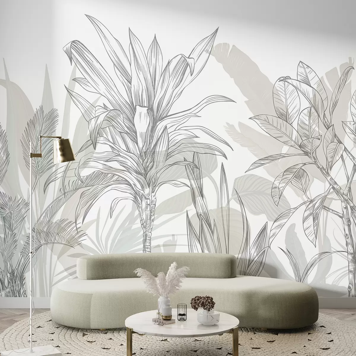 Fototapet En tropisk grafisk plante med store, frodige blade og blomster i grå og hvide nuancer med grønne blomstersilhuetter Nr. w08327