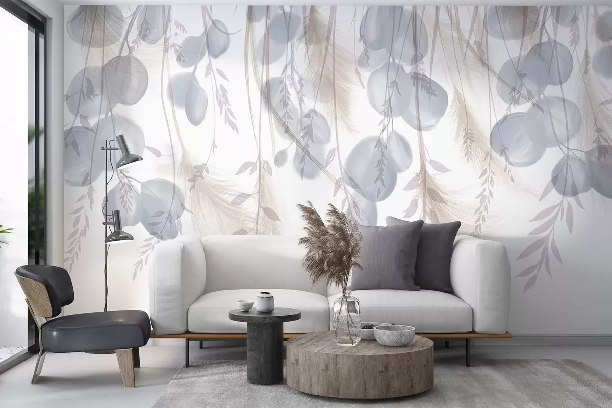 Fototapet Delikate blå og pastelbeige eukalyptusblade falder og skaber en fredfyldt og beroligende atmosfære Nr. w08380v1