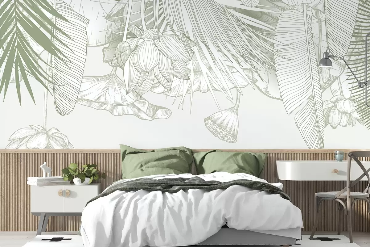 Fototapet Et nærbillede af et grønt blomsterprint med store, overlappende kronblade og blade i en monokrom farve Nr. w08389v1