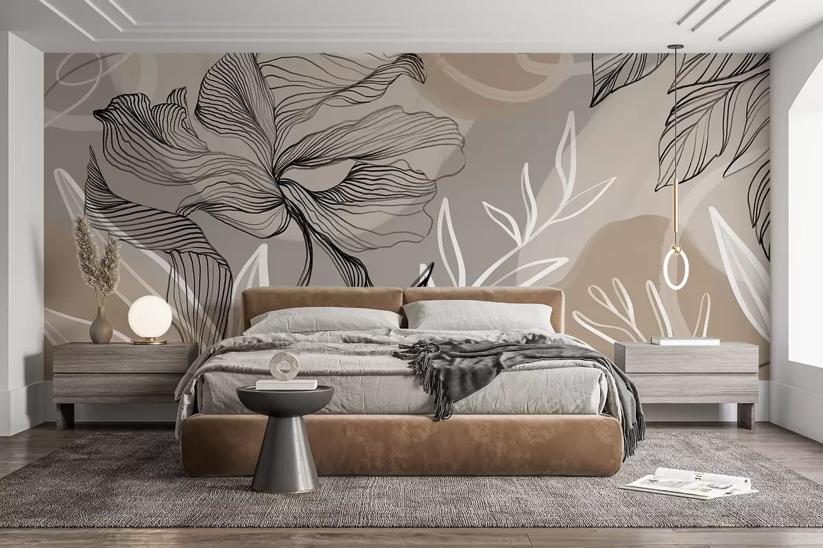 Fototapet Elegant blomsterprint med store abstrakte linjeblomster og blade i grå og beige nuancer på en lys baggrund Nr. w08413