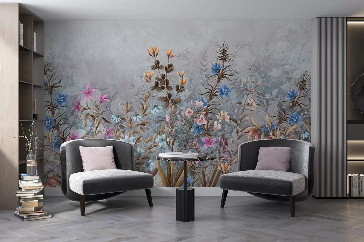 Fototapet Et frodigt, levende blomsterprint med farverige blomster og planter med indviklede detaljer og teksturer Nr. w08428