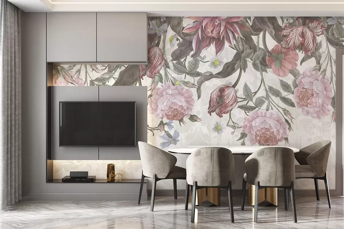 Fototapet Et frodigt blomsterarrangement med store lyserøde og hvide blomster, med grønne blade og stilke Nr. w08435