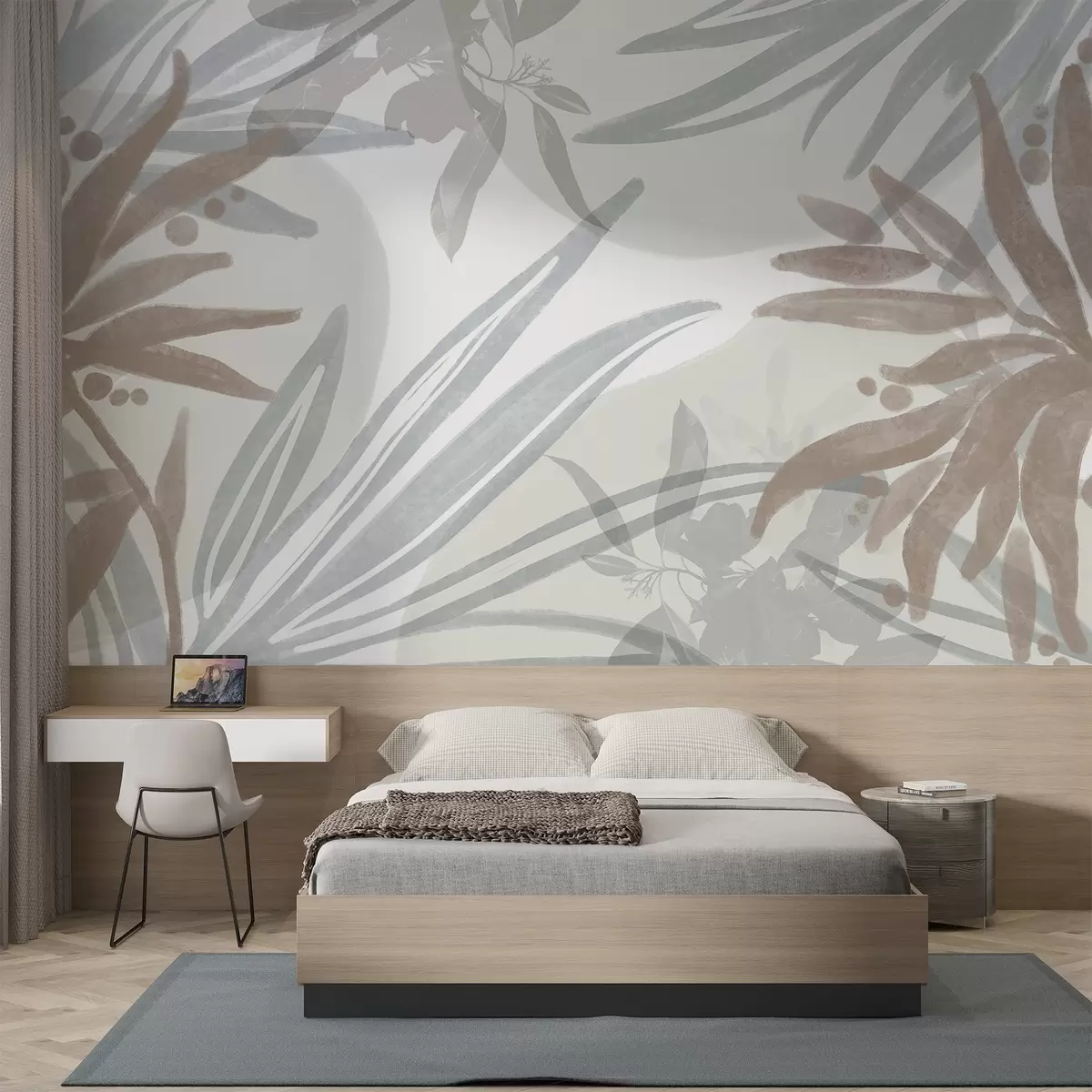 Fototapet Et neutralt tonet abstrakt blomstermønster med overlappende blade og former i grå, hvide og beige nuancer Nr. w08464