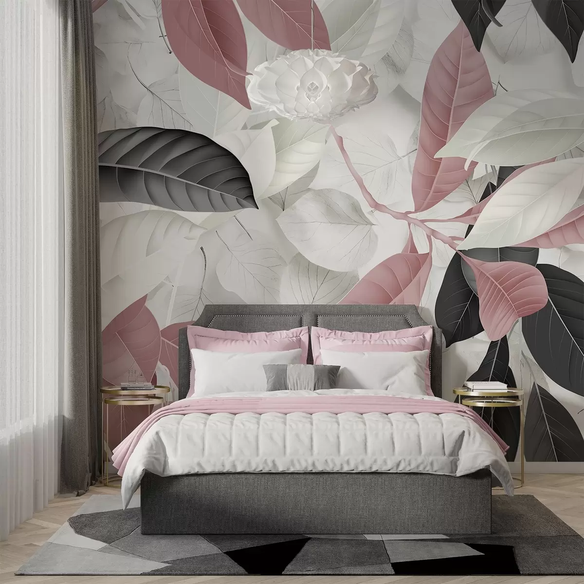 fototapeter Stort print af lyserøde og grå blade på en baggrund med lys bladstruktur, der skaber en frodig tropisk stemning w08468
