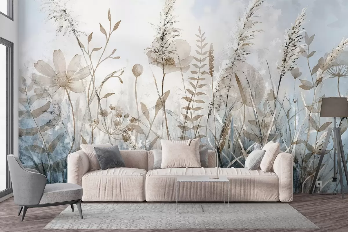 Fototapet En mark med højt græs, naturligt løv og planter med bløde, spinkle teksturer mod en diset, overskyet himmel Nr. w08472