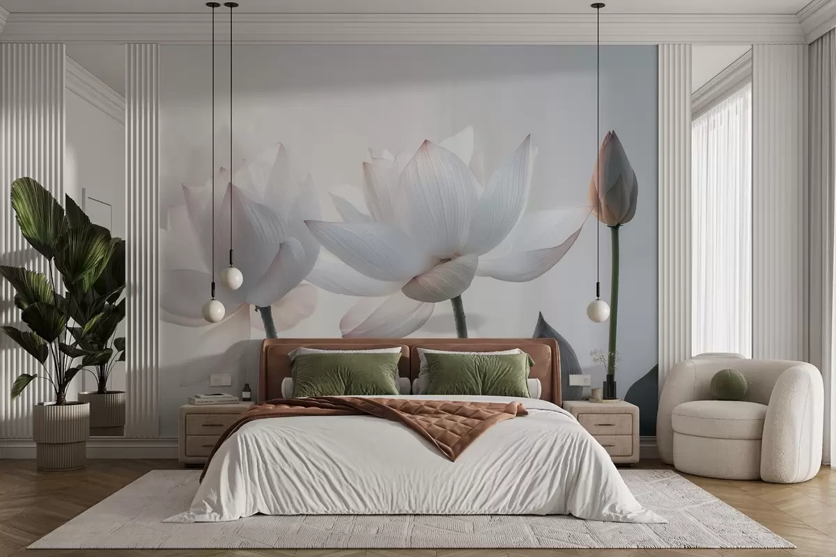 Fototapet Blide lotusblomster med kronblade og blade Nr. w08488