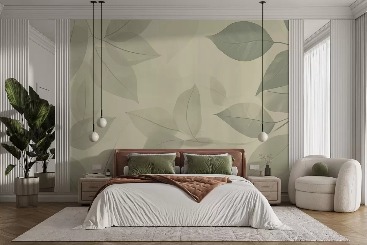 Fototapet Grene af grønne blade på en blød beige baggrund Nr. w08502v2
