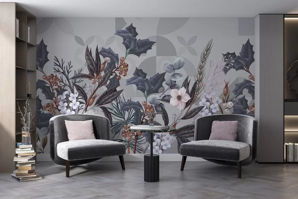 Fototapet Blomsterarrangement med store mørke blade, blomster og bær på en dæmpet grå geometrisk abstrakt baggrund Nr. w08525