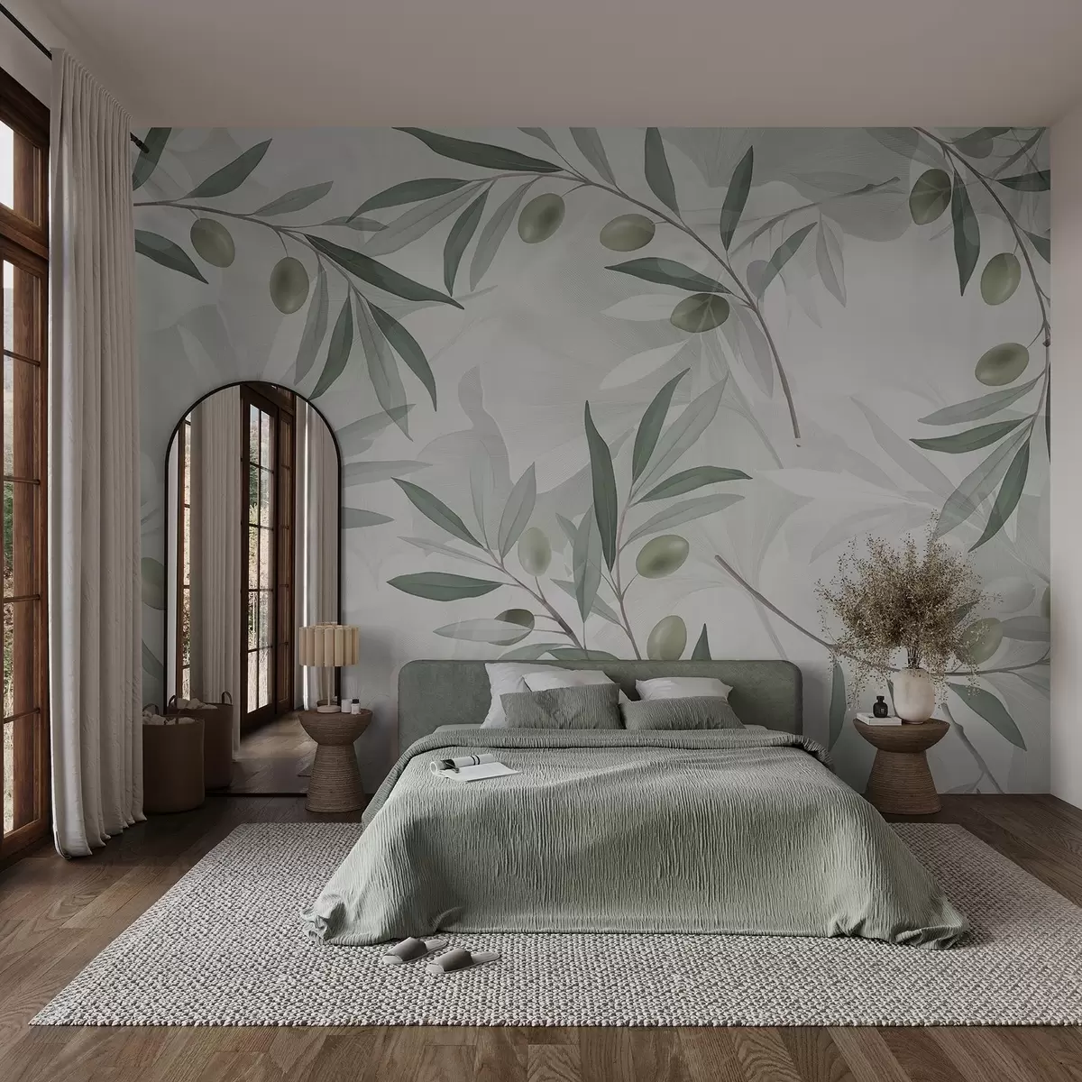 Fototapet Olivengrene med grønne blade og oliven på en lys baggrund Nr. w08576
