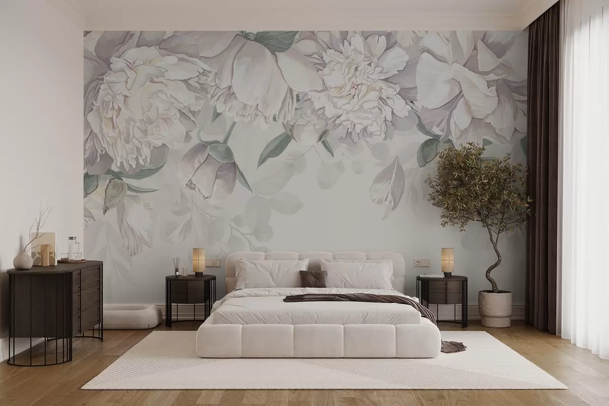 Fototapet Sarte hvide og rosa pastelfarvede pæoner med grønne blade, arrangeret i en blød, romantisk blomsterbaggrund Nr. w08577