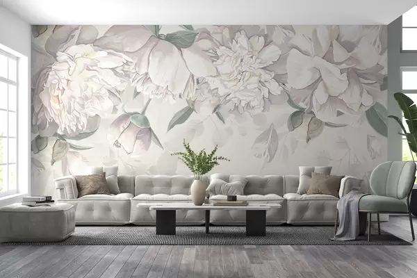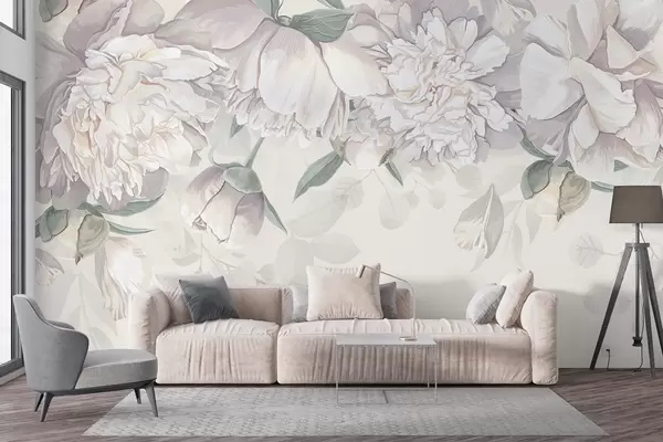 Fototapet Sarte hvide og rosa pastelfarvede pæoner med grønne blade, arrangeret i en blød, romantisk blomsterbaggrund Nr. w08577