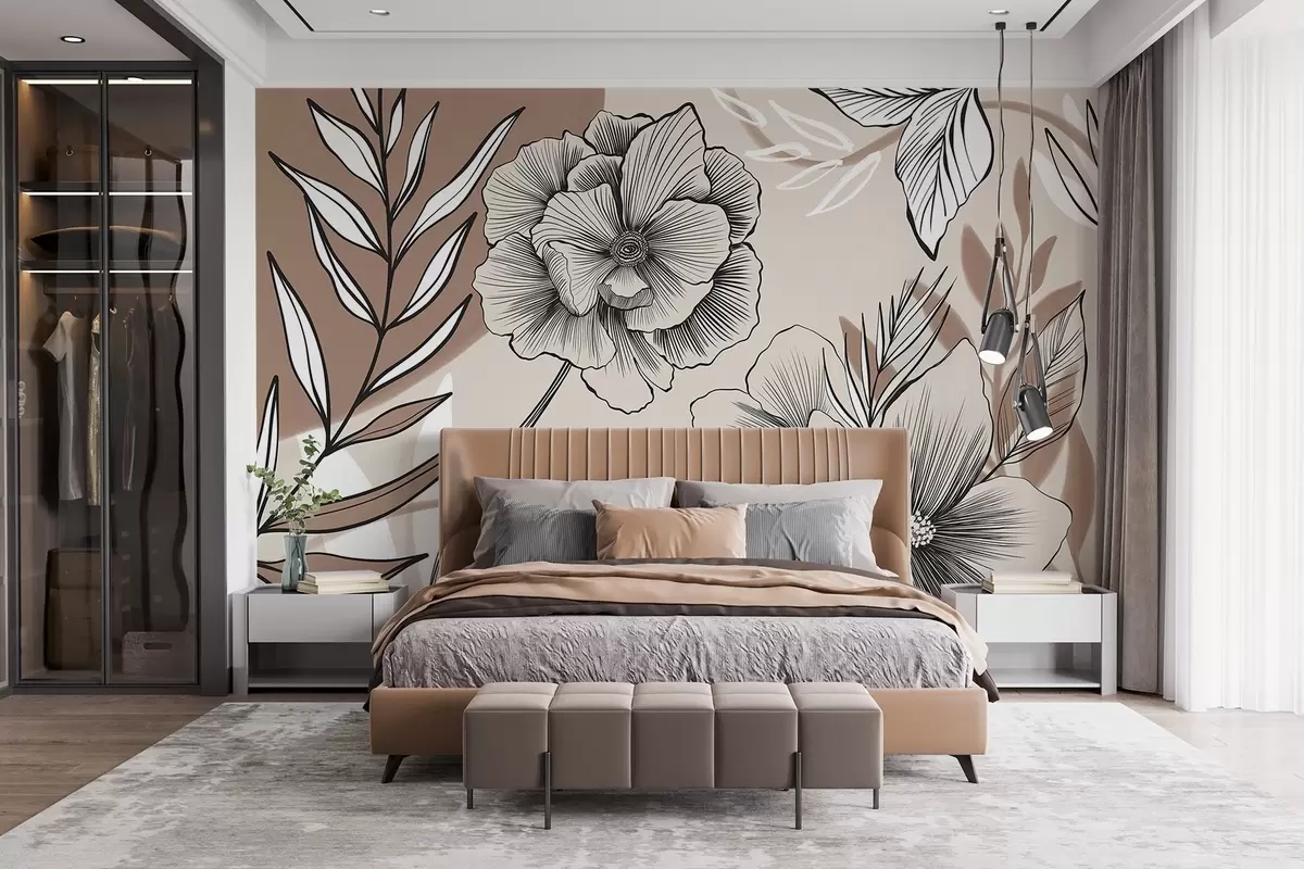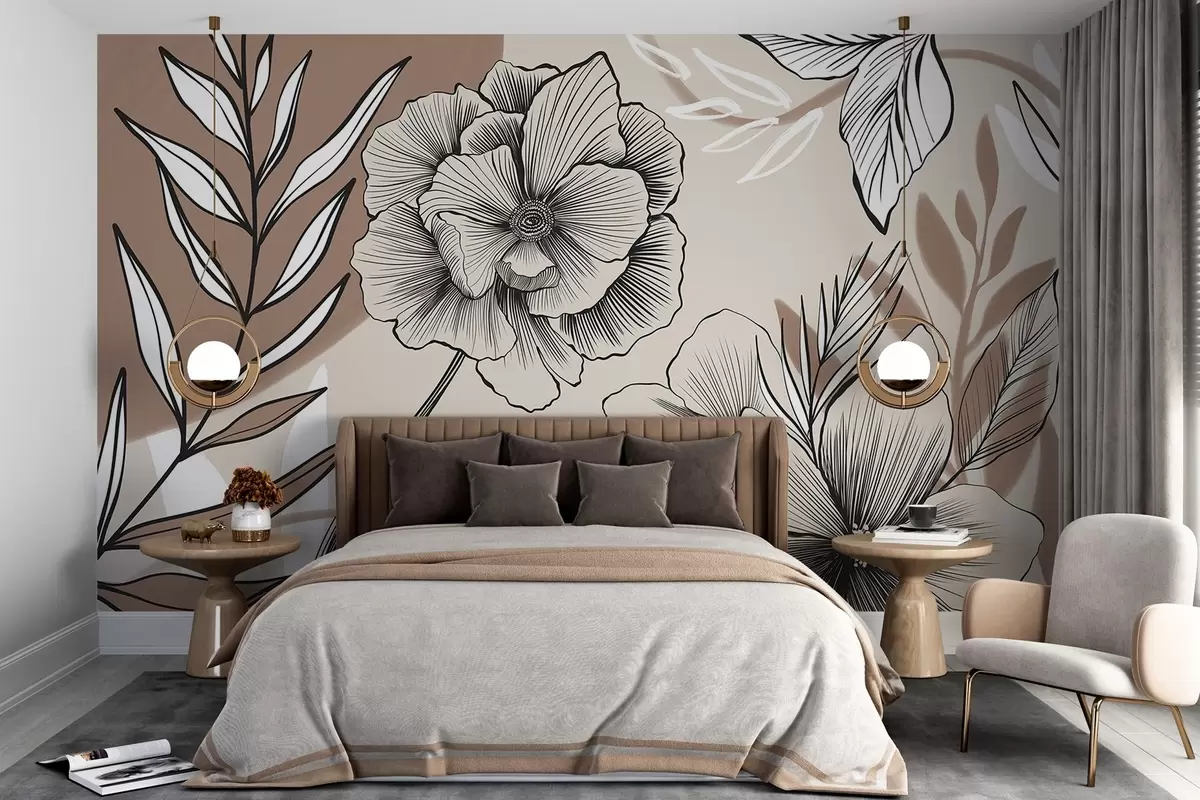 Fototapet Store sorte og hvide grafiske blomster med detaljerede blade på en beige abstrakt baggrund Nr. w08580
