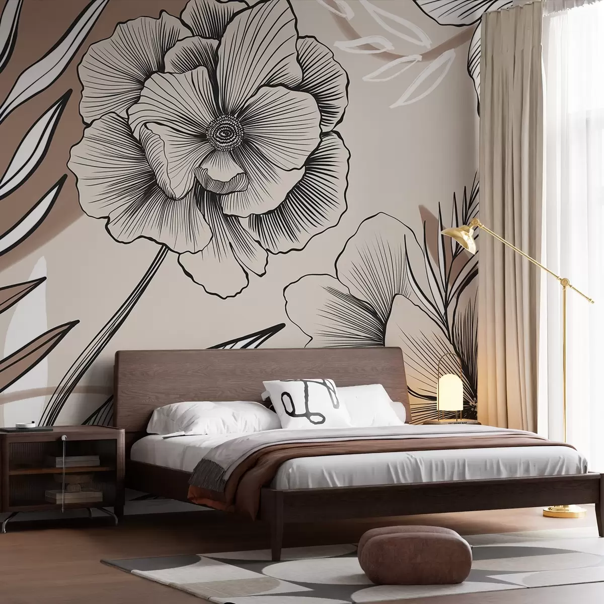 Fototapet Store sorte og hvide grafiske blomster med detaljerede blade på en beige abstrakt baggrund Nr. w08580
