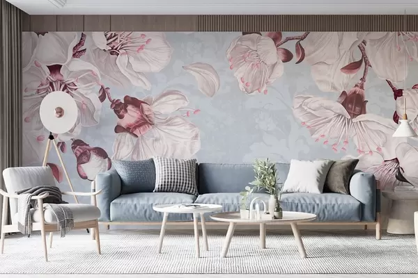 Fototapet Et blomsterprint med store lyserøde og hvide kirsebærblomster mod en lyseblå struktureret baggrund Nr. w08601