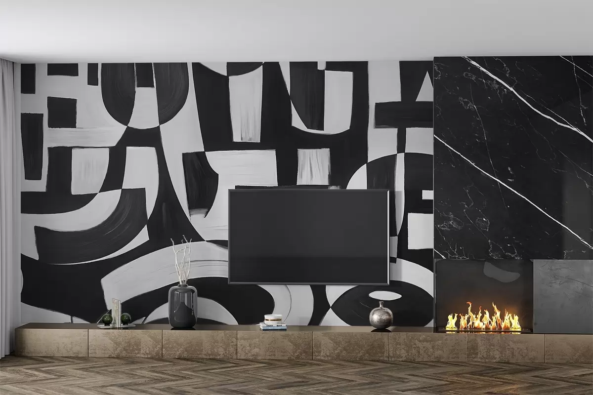 Fototapet Abstrakte sorte og hvide geometriske former og mønstre, der skaber en visuelt slående og dynamisk komposition Nr. w08608