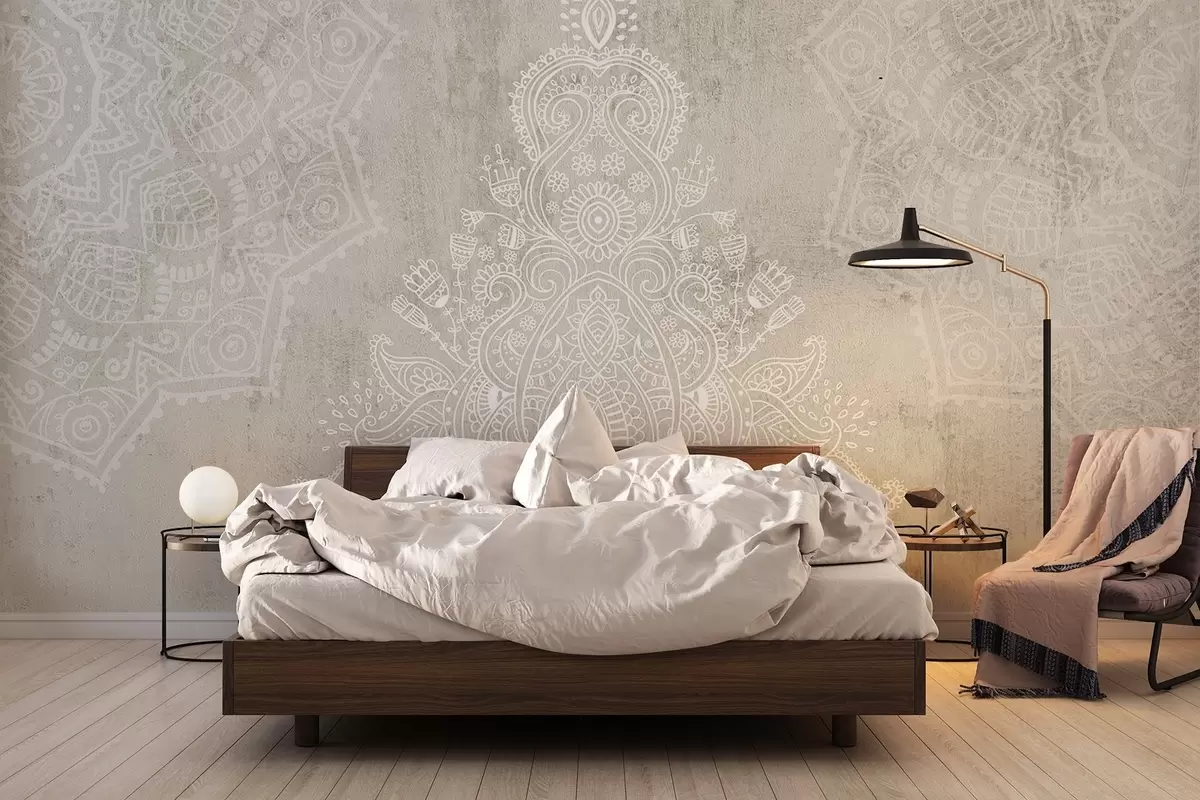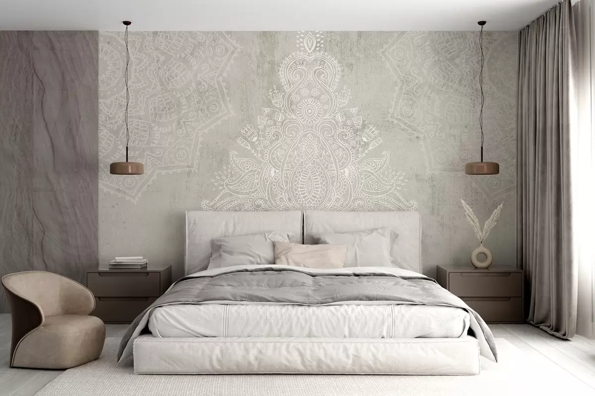 Fototapet Et detaljeret, indviklet mandalaprint med hvide blonder på en lys beige tekstureret abstrakt baggrund Nr. w08614