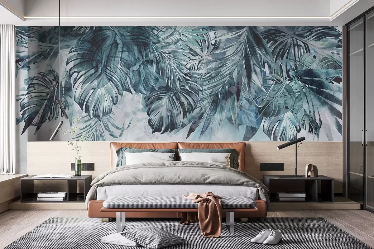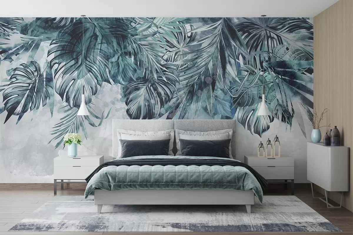 Fototapet Tropiske blade i blågrønne nuancer, der falder ned fra toppen mod en lys, struktureret baggrund Nr. w08667