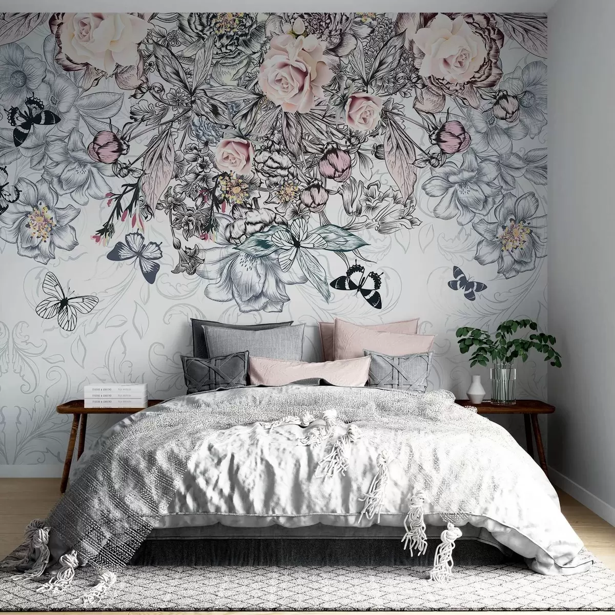 Fototapet En blomstertegning med lyserøde roser og forskellige blomster og sommerfugle med indviklet stregtegning på struktureret baggrund Nr. w08674