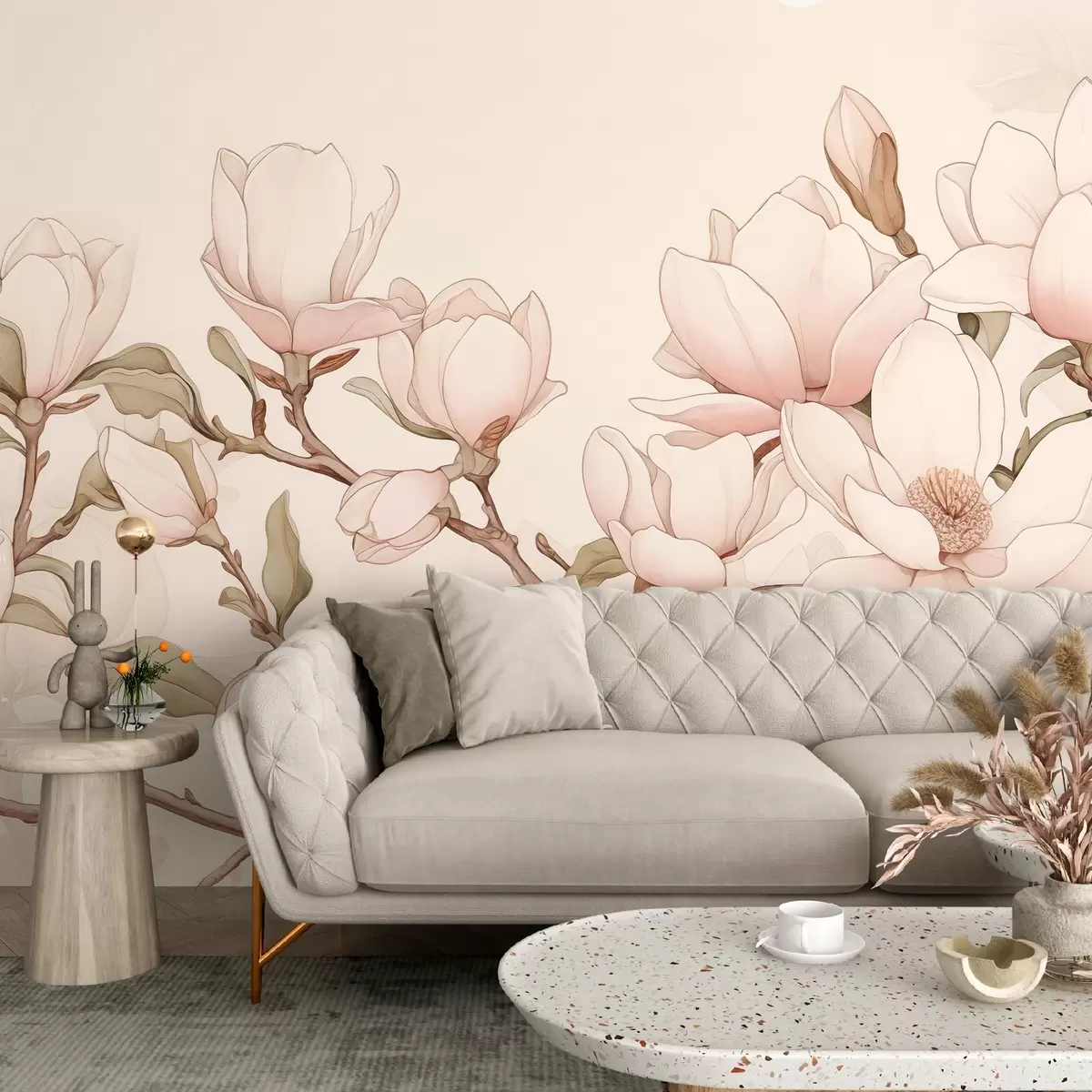 Fototapet Magnoliagrene med sarte rosa blomster på en lys baggrund, der skaber en sofistikeret og rolig atmosfære Nr. w08688