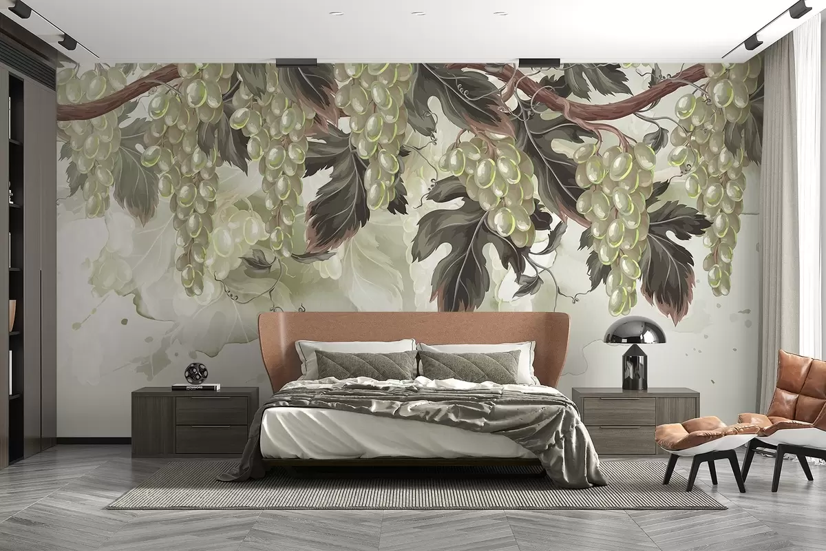 Fototapet Druer, der hænger fra en vinranke med grønne blade, på en lys baggrund med akvarellignende teksturer Nr. w08696