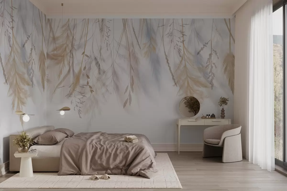 Fototapet Delikate græsser, pigge og planter i pastelfarver, arrangeret i et kaskaderende print mod en lys baggrund Nr. w08737