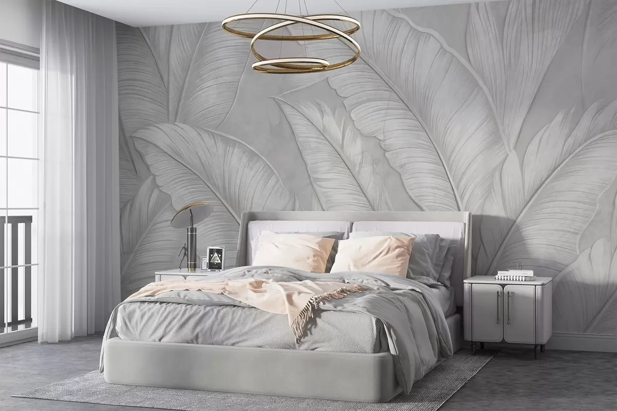 Fototapet Meget strukturerede detaljerede store tropiske blade i en monokromatisk lysegrå farve i loftstil Nr. w08772