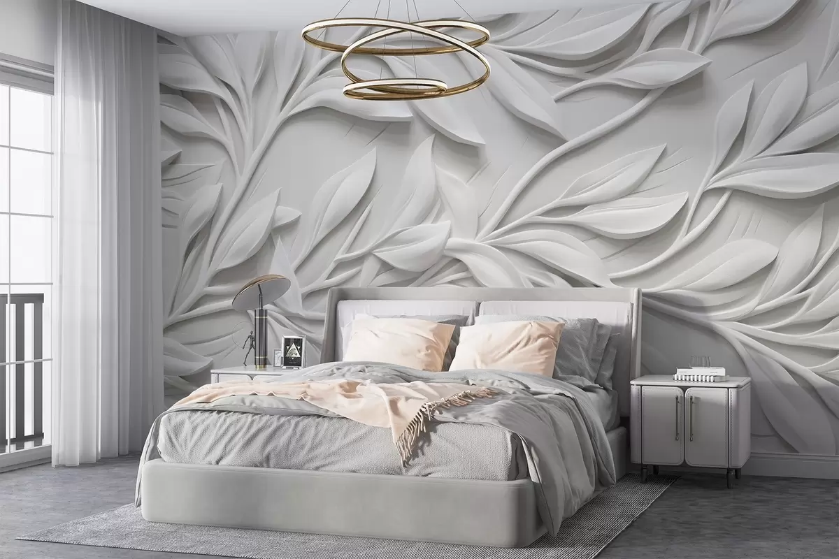 Fototapet Hvidt tekstureret print med blade og grene, der skaber en voluminøs imitationseffekt på en tekstureret baggrund Nr. w08778