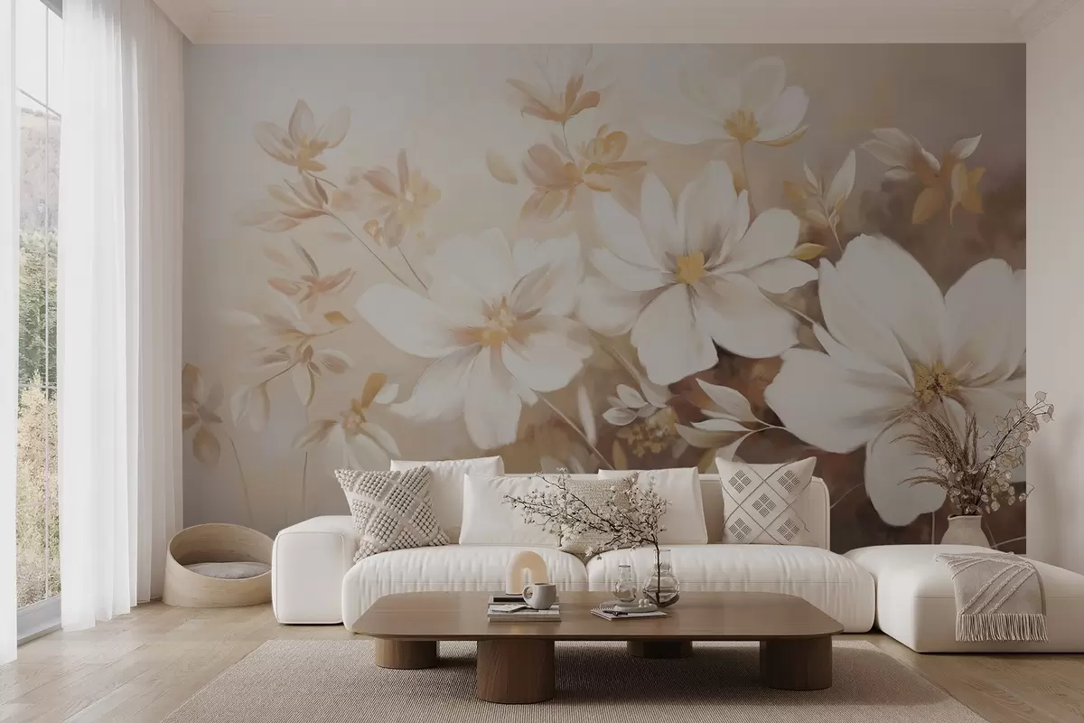 Fototapet Hvidmalede blomster med bløde kronblade og fine blade på en lys beige og cremefarvet baggrund Nr. w08780