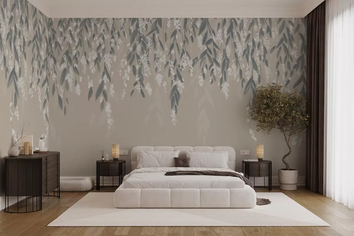 Fototapet Kaskader af løvgrene i dæmpede grønne nuancer med hvide blomster og blade på beige baggrund Nr. w08781