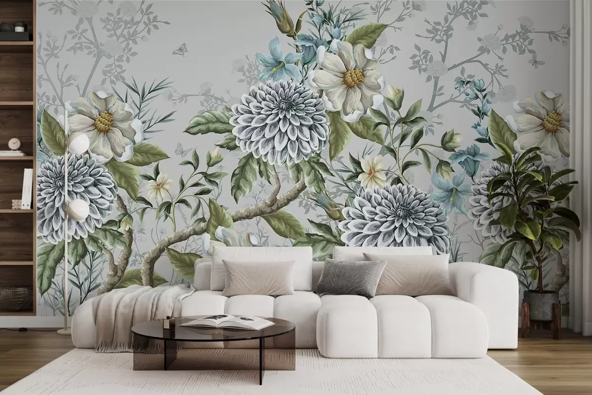Fototapet Et blomsterprint med krysantemum, sarte blå blomster og grønne blade flettet sammen med grene Nr. w08782