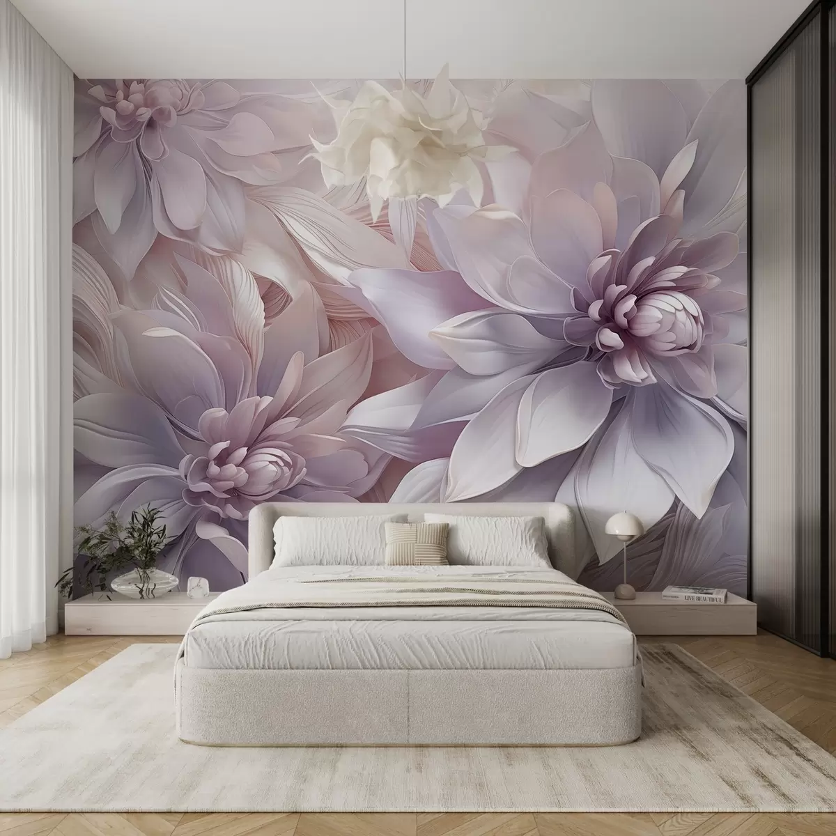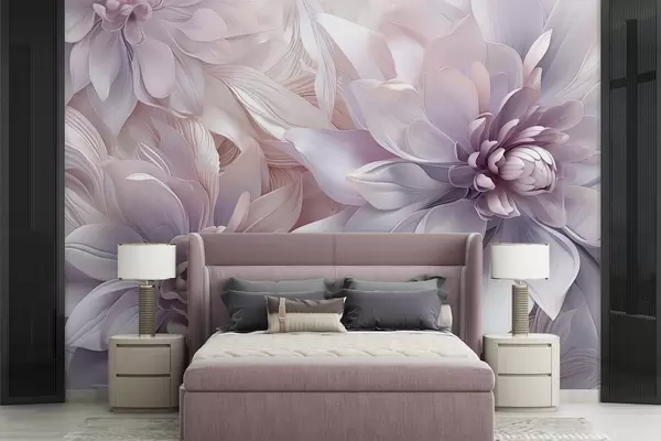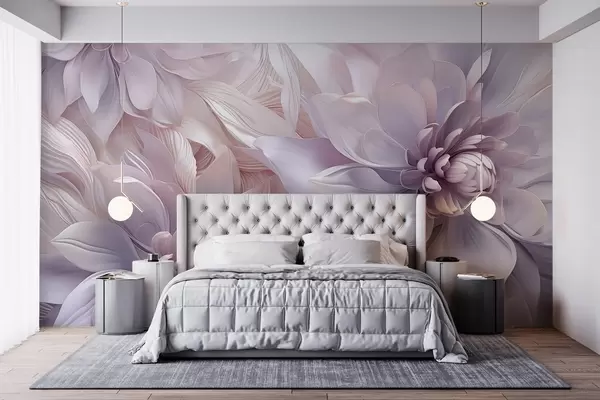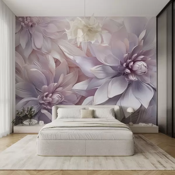 Fototapet Bløde, lagdelte blomster i nuancer af lyserød, lavendel og hvid med fine kronblade og indviklede detaljer Nr. w08783