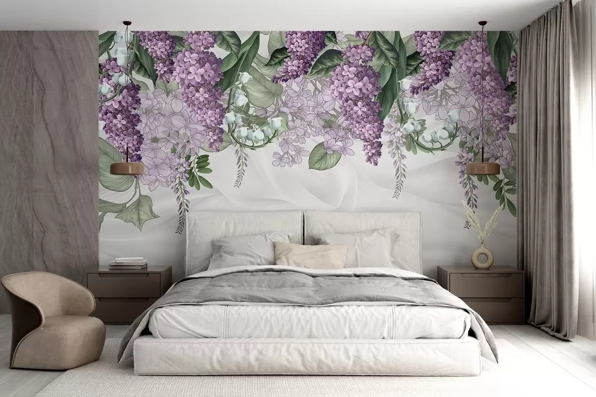 Fototapet Pastellilla blomster og grønne blade på en hvid baggrund med struktur af imiteret silke Nr. w08825