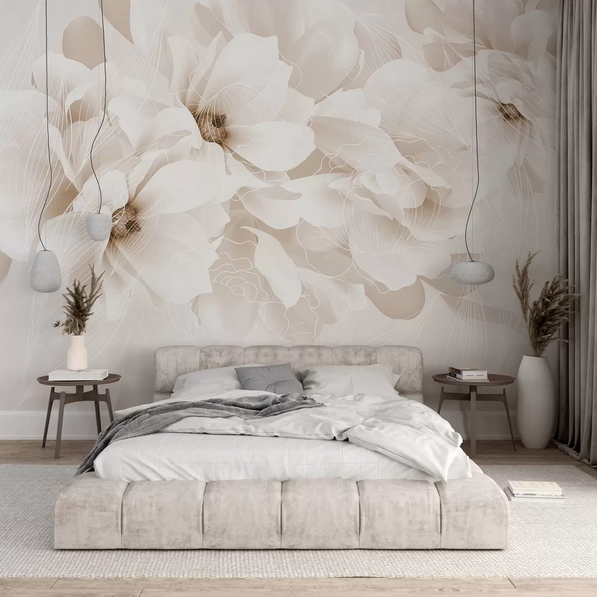 Fototapet Pastelfarvede pæonblomster med hvide og beige sarte kronblade og hvide linjer på en lys beige baggrund Nr. w08826v1