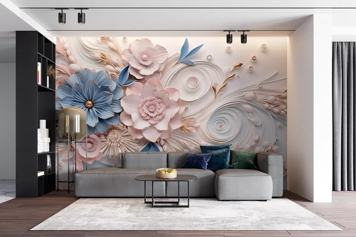 Fototapet En delikat blomsterkomposition i rosa og blå toner med en blød reliefbaggrund Nr. w08847