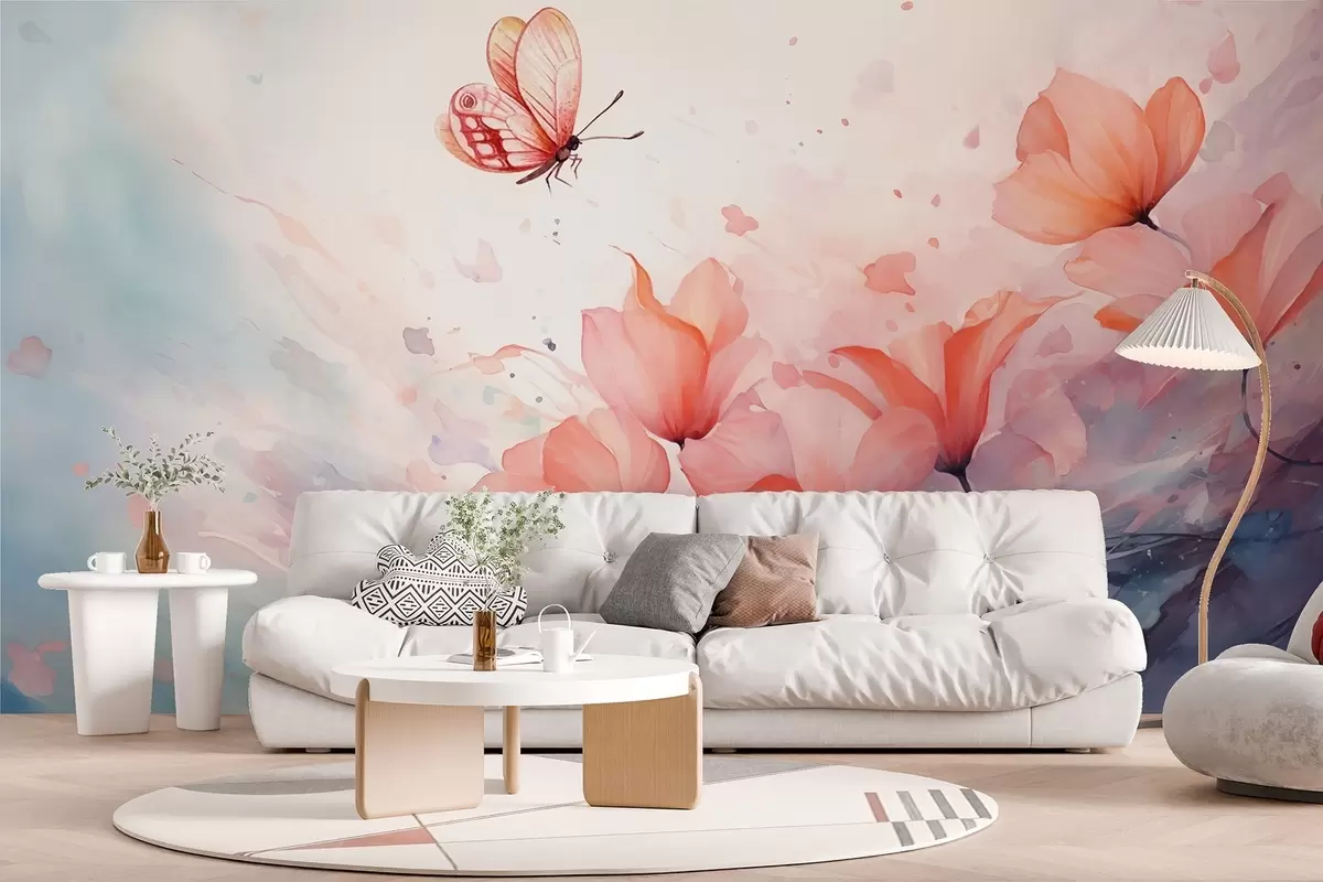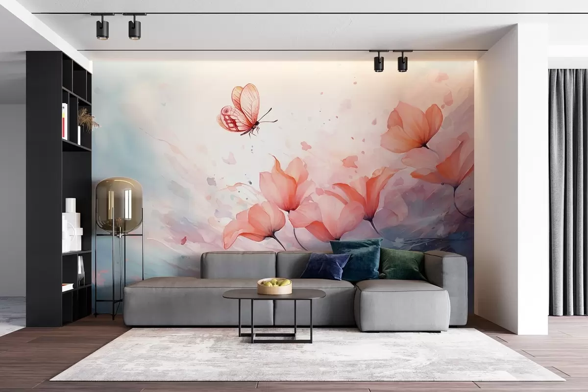 Fototapet Delikate valmuer med en sommerfugl i akvarel-stil Nr. w08849