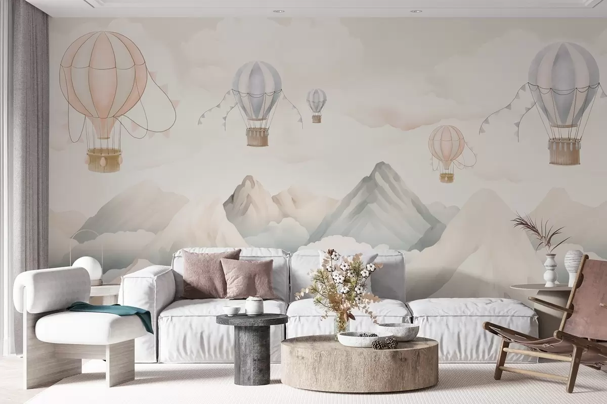 Fototapet Varmluftsballoner svæver over bjerge i neutrale, bløde pastelfarver Nr. w08853