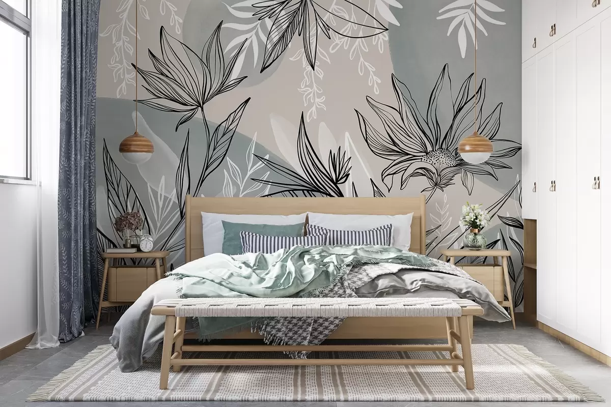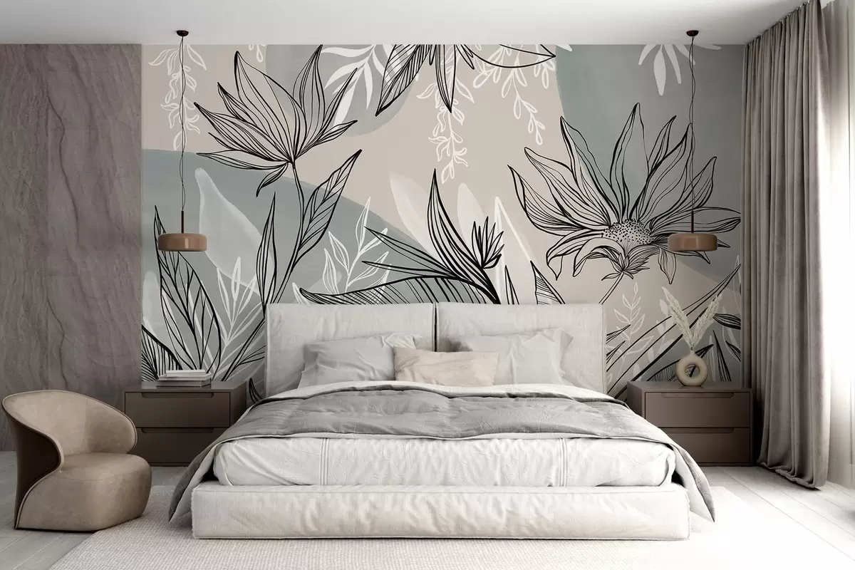 Fototapet Blomstret stregtegning med store blade og blomster på en baggrund af beige og blå akvarelfarver Nr. w08865