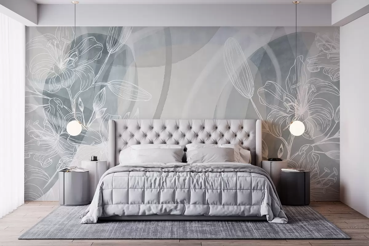 Fototapet Minimalistisk blomsterdesign med hvide stregblomster og blade, overlappende abstrakte cirkler i grå og blå nuancer Nr. w08979