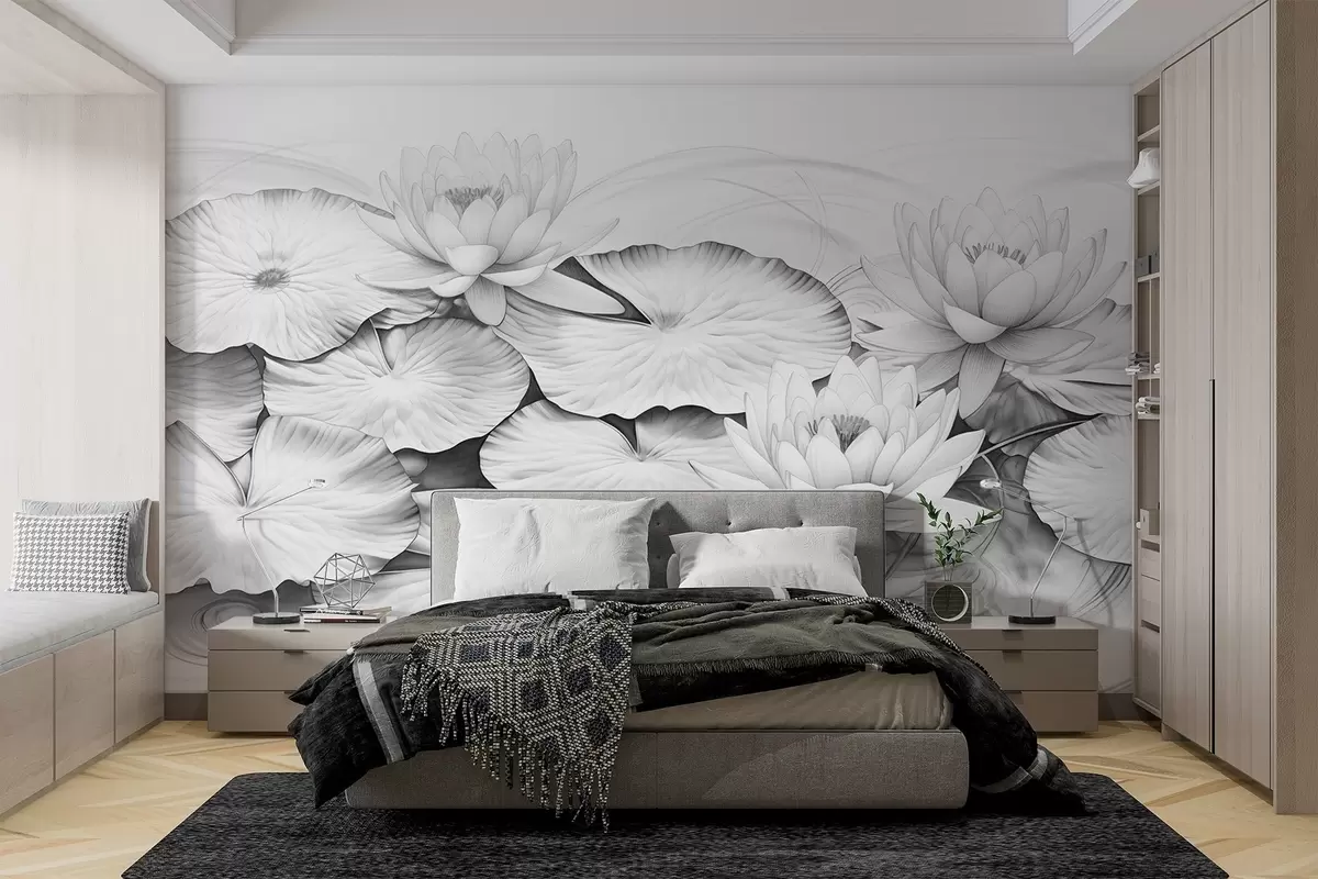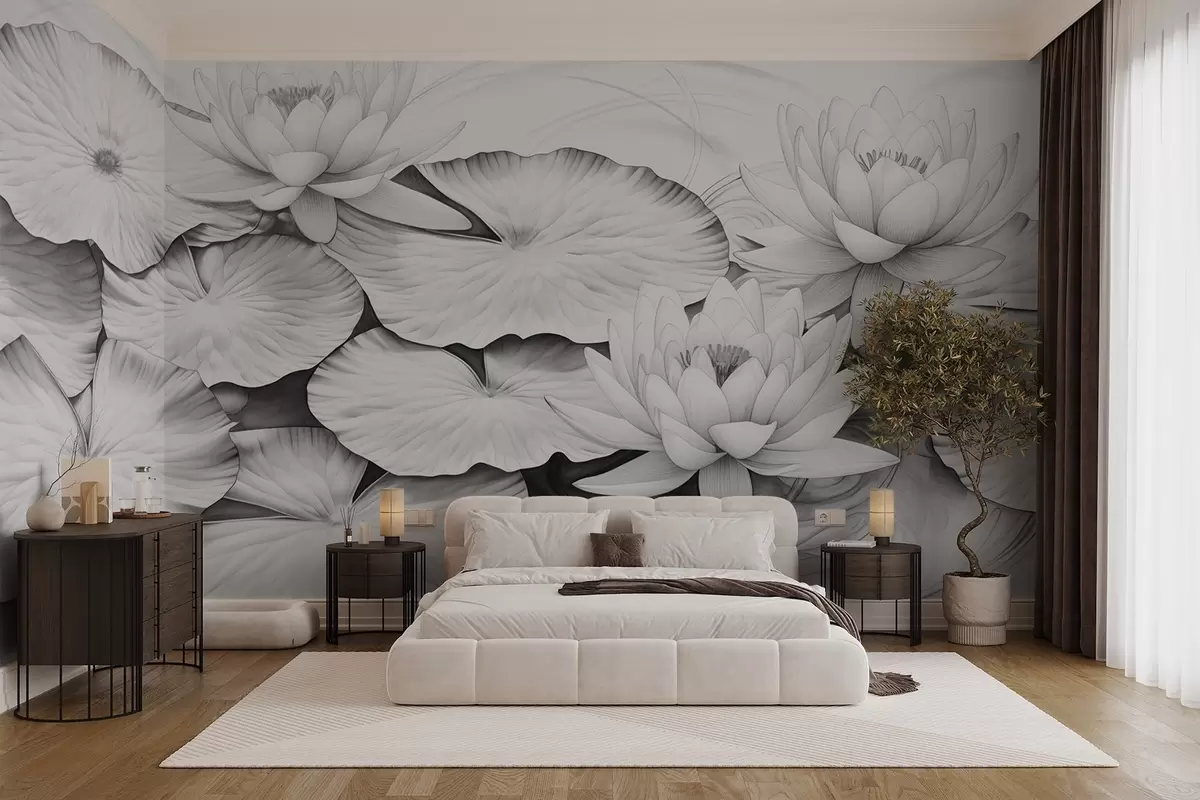 Fototapet Åkander og åkandeblade i en dam, sort-hvid efterligning af blyantstegning, detaljeret botanisk illustration, naturkunst Nr. w09006
