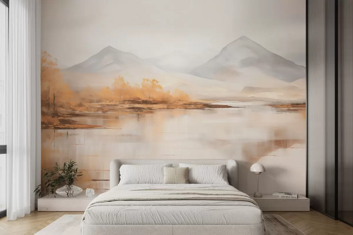 Fototapet Efterårslandskab med gule træer og en flod mod en bjergkulisse Nr. w09020